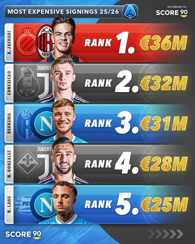 目前,意甲已有5支球队转会支出超过1亿欧元(英超为11支),显示出联赛整体购买力的提升。卫冕冠军那不勒斯为满足新帅孔蒂的要求,进行了多笔引援,实力得到增强,有望再度冲击冠军。