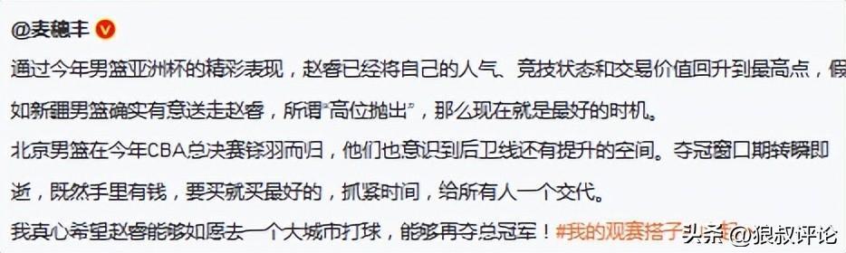 媒体人麦穗丰发文点评:通过今年男篮亚洲杯的精彩表现,赵睿已经将自己的人气、竞技状态和交易价值回升到最高点,假如新疆男篮确实有意送走赵睿,所谓“高位抛出”,那么现在就是最好的时机。