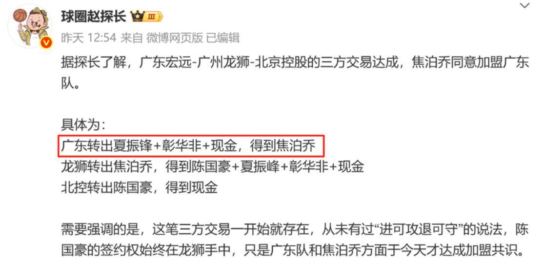 29日下午,广东男篮官方正式公布了与广州、北控的三方交易:广东球员彰华非将转会广州龙狮;北控球员陈国豪独家签约权交易至广州龙狮;同时,焦泊乔将转会加盟广东宏远。待CBA公司审核、公示通过后,焦泊乔将身披16号战袍代表广东东阳光队征战2025-26赛季CBA联赛。
