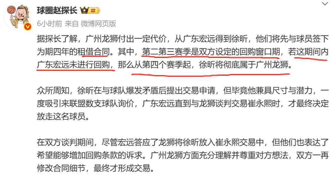 而在球圈赵探长之后补充的消息中,广东总经理朱芳雨在这笔交易中“留了后手”,那就是在交易中增加回购条款。广州队将先与徐昕签下为期四年的租借合同。其中,第二第三赛季是双方设定的回购窗口期,若这期间内广东宏远未进行回购,那么从第四个赛季起,徐昕将彻底属于广州龙狮。